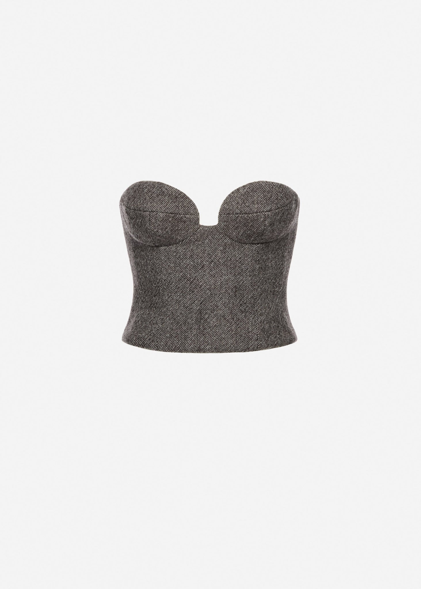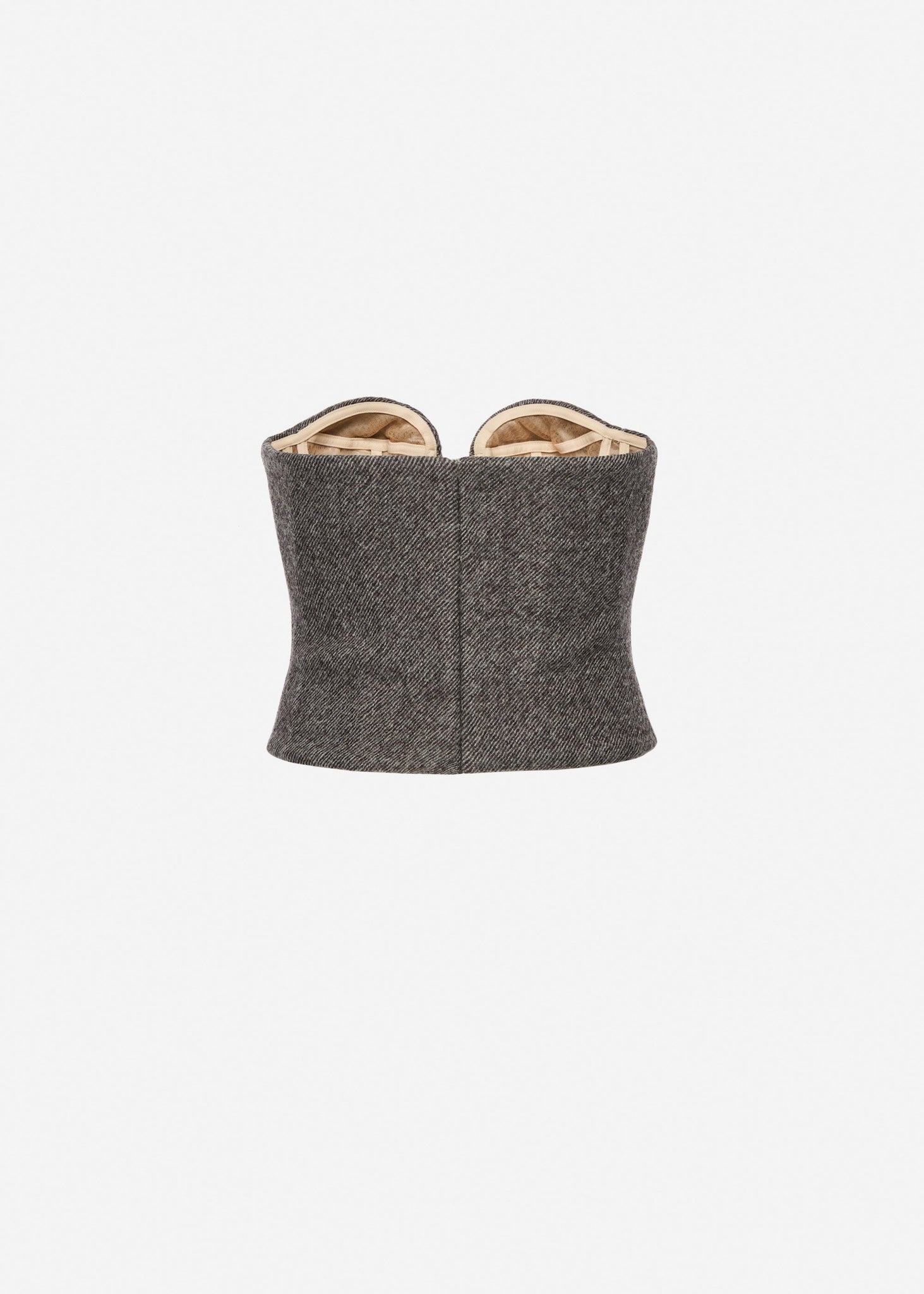 A sculpted bustier top made from structured wool in a classic grey herringbone weave. This piece features a sweetheart neckline and contoured seams to accentuate the waist, offering a tailored silhouette with a nod to vintage elegance. Fully lined for comfort, it’s an elevated layering essential that transitions seamlessly from day to night.
