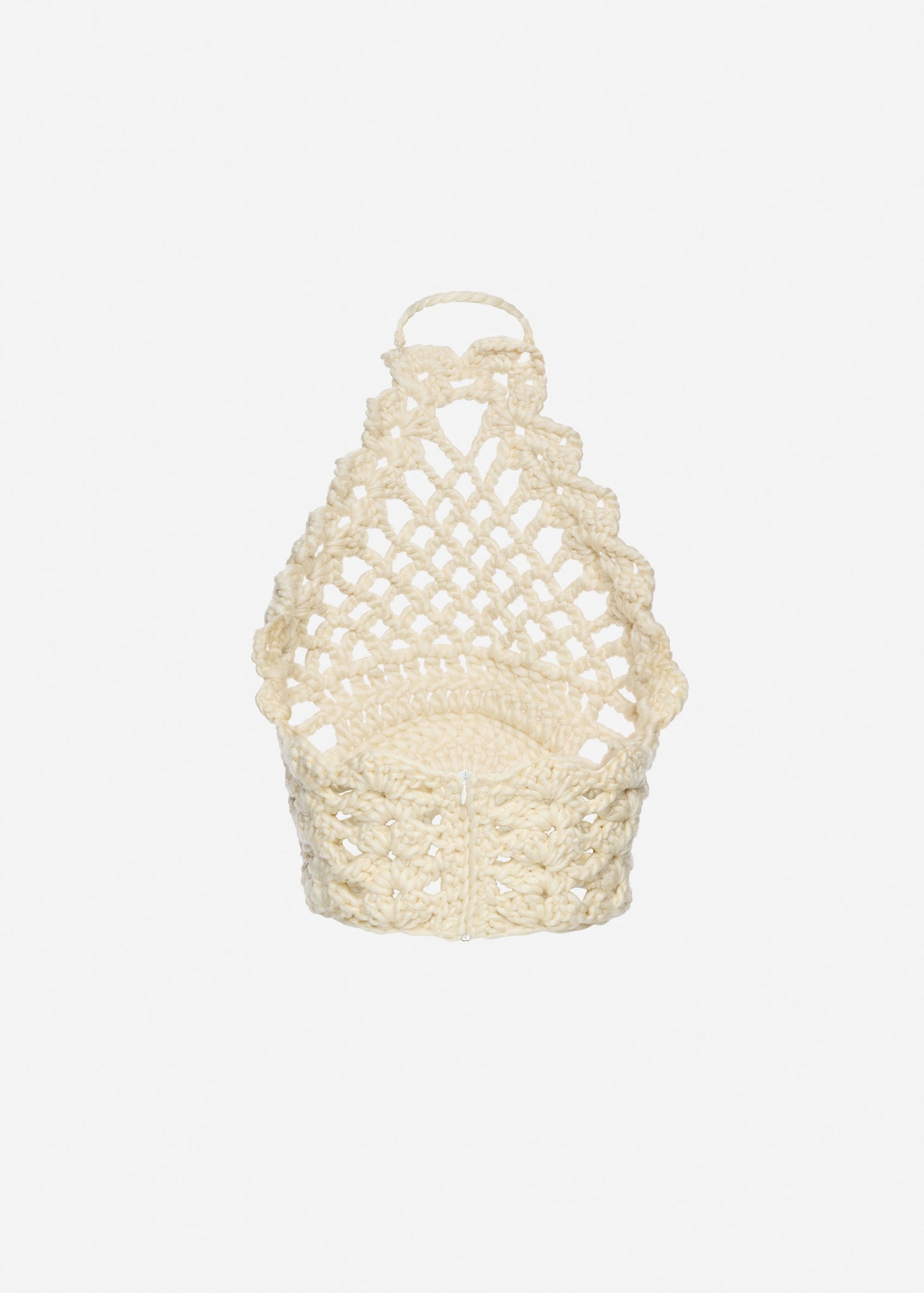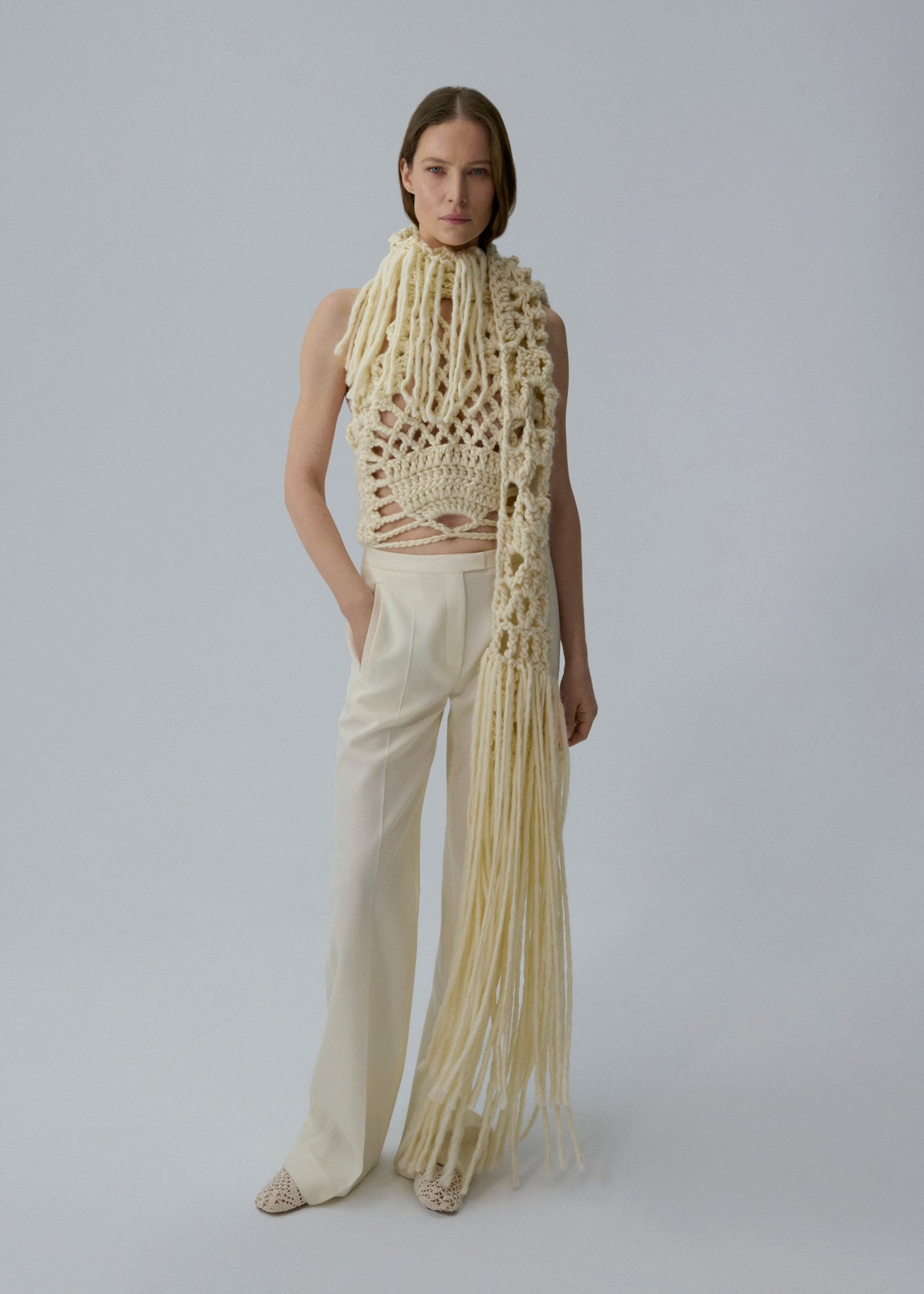 A handmade crochet halter top with an open back and high neckline. Features intricate knit detailing and a concealed zip closure at the back. Style with the matching long fringe scarf for a full look.