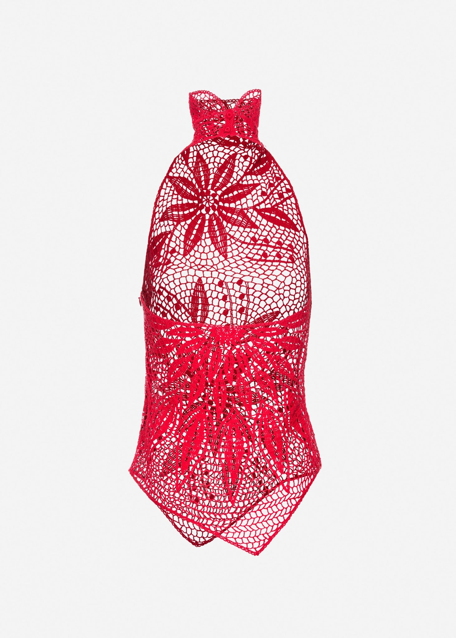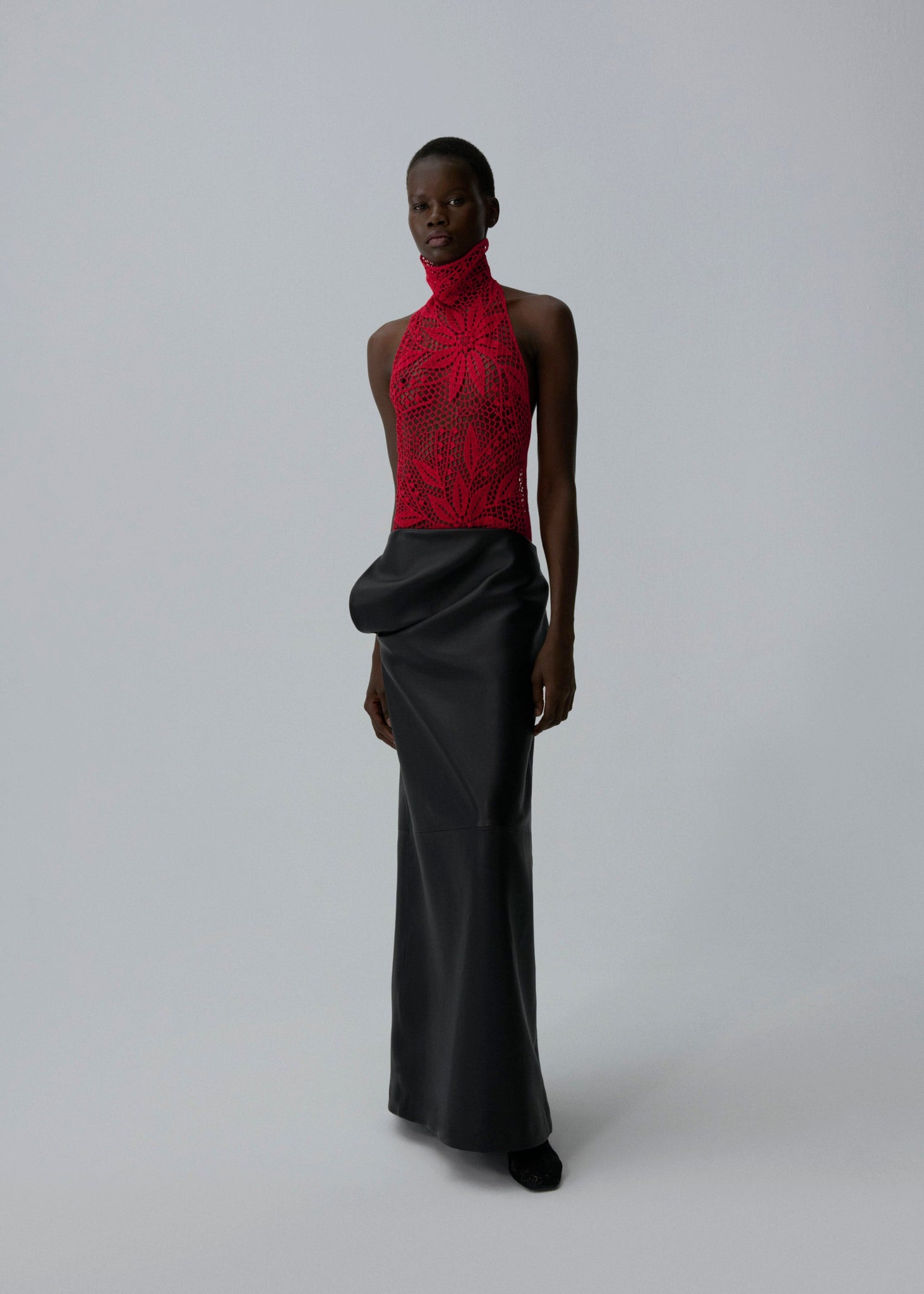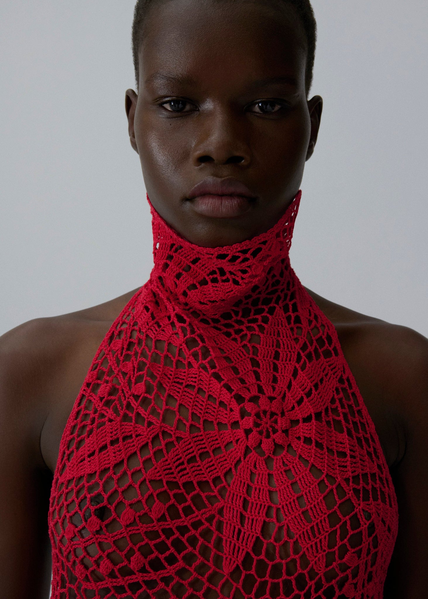 A handmade halter top in Magda’s signature red, crafted from intricate floral crochet. Designed with a sculpted high-neck silhouette and pointed hemline, this piece fastens with a concealed zip closure on the side. To recreate the full look, style it underneath the matching bustier midi dress in red.
