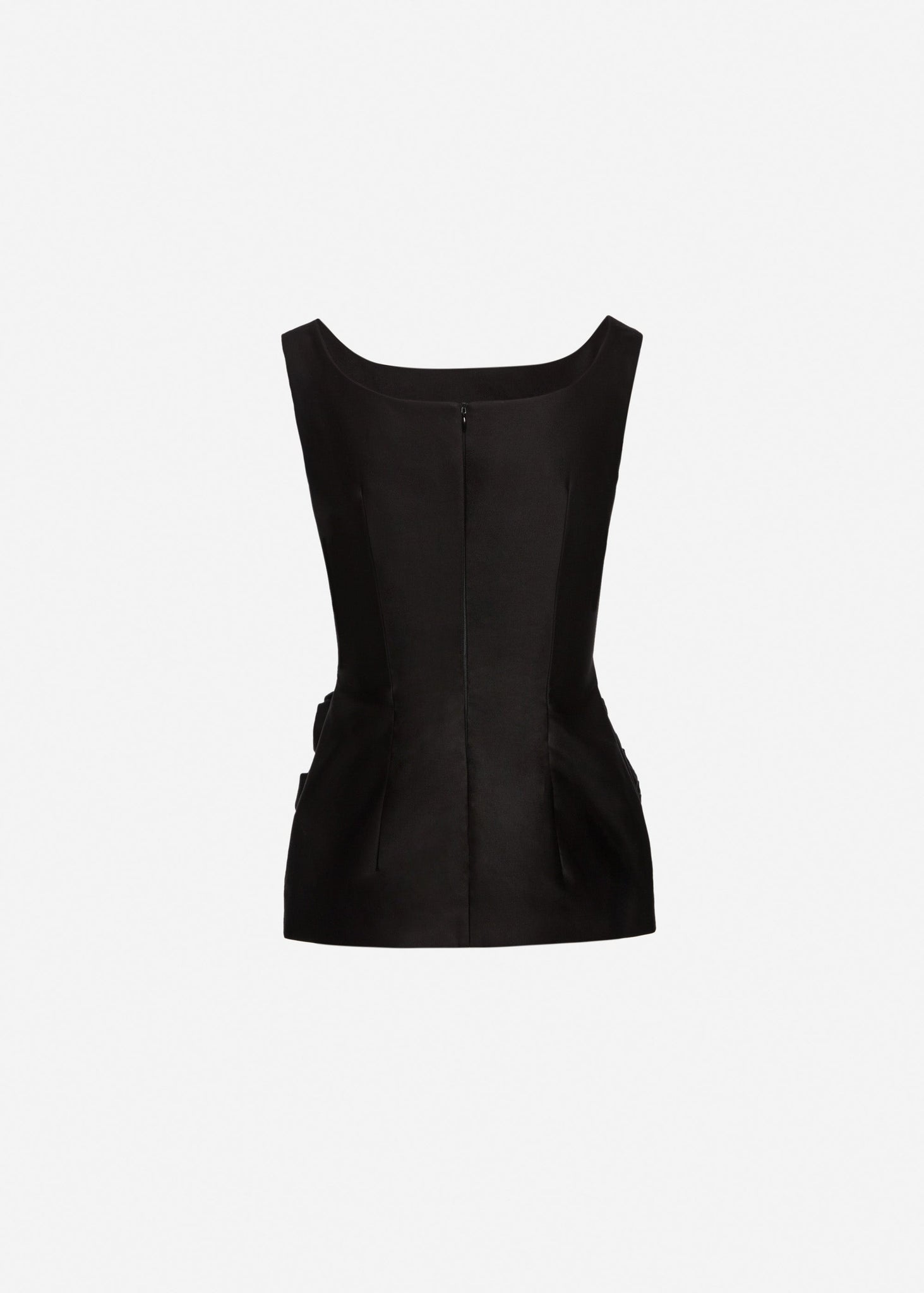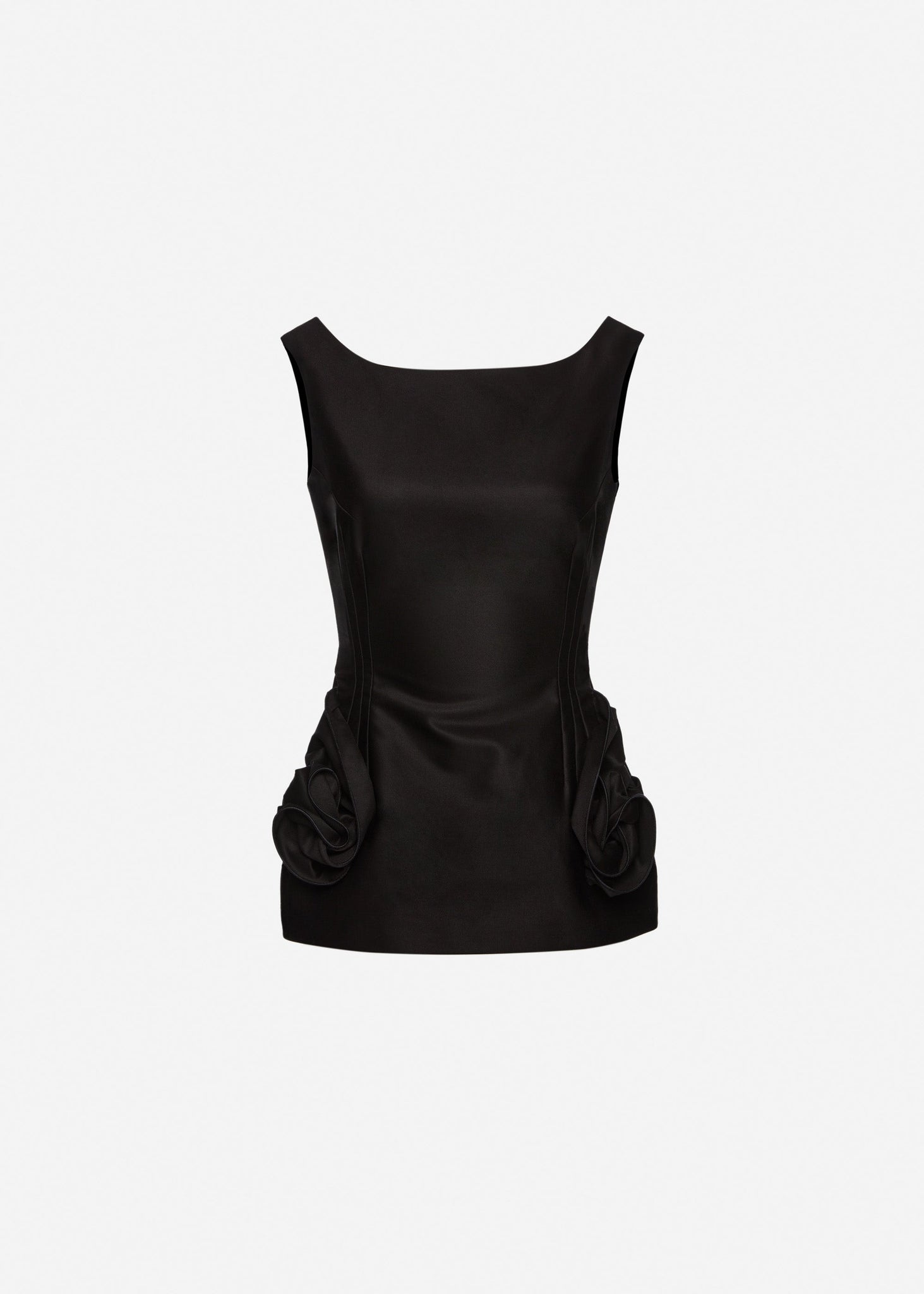 A structured cotton sheath top with a longline length and hourglass shape, hugging the waist and flaring out at the hips. Rose appliqué bunches adorn the hips for a signature Magda Butrym touch, finished with a sleeveless cut and round neck.