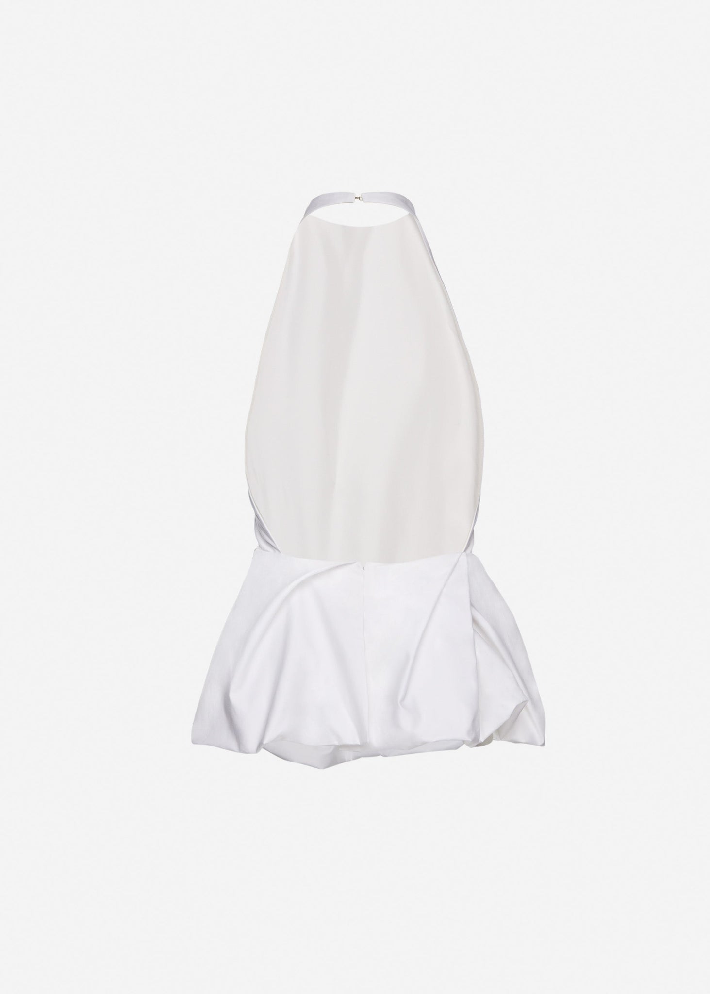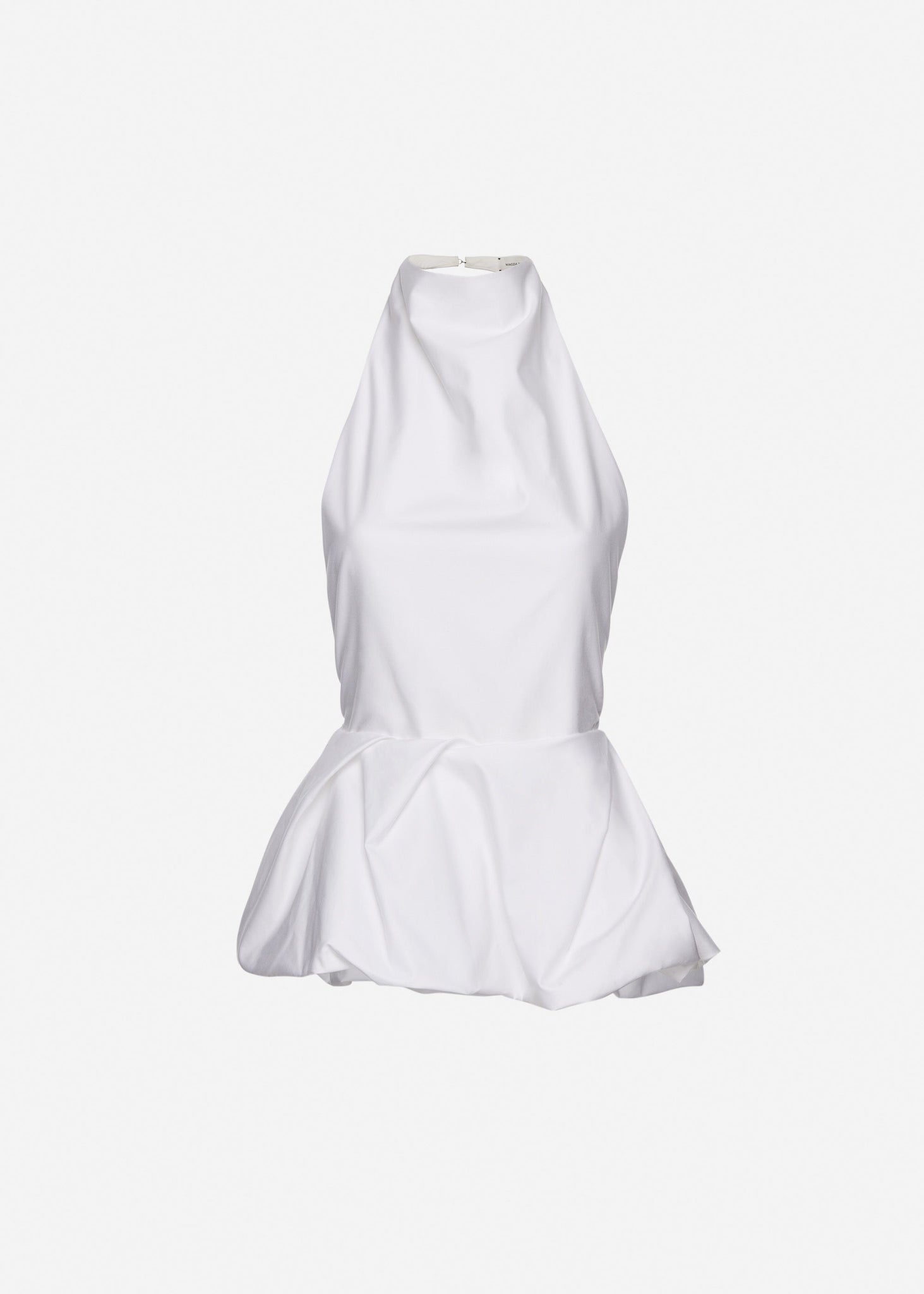 A sleeveless halter neck top made from poplin cotton, with a flared peplum hem that starts from the waist and an open back.