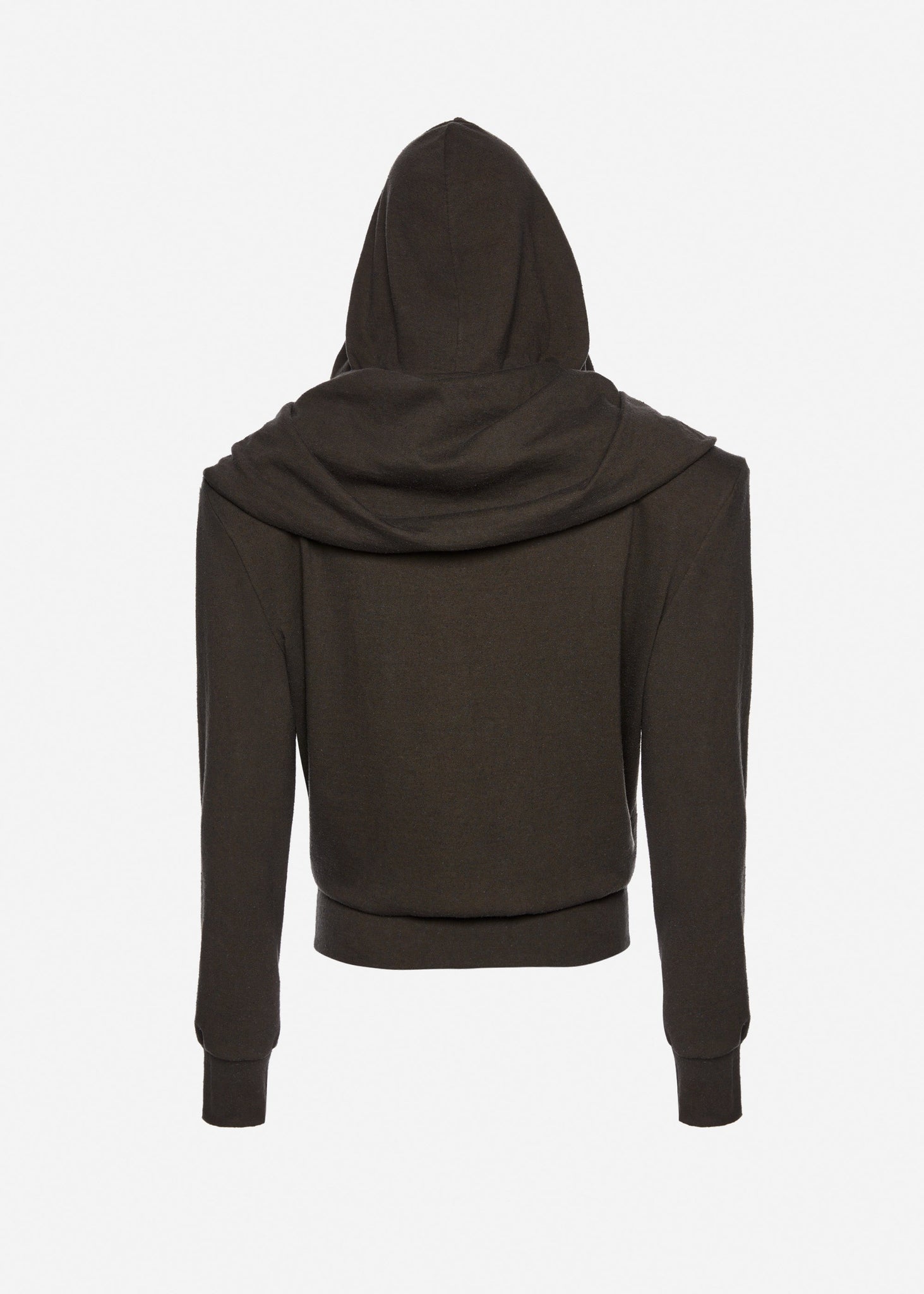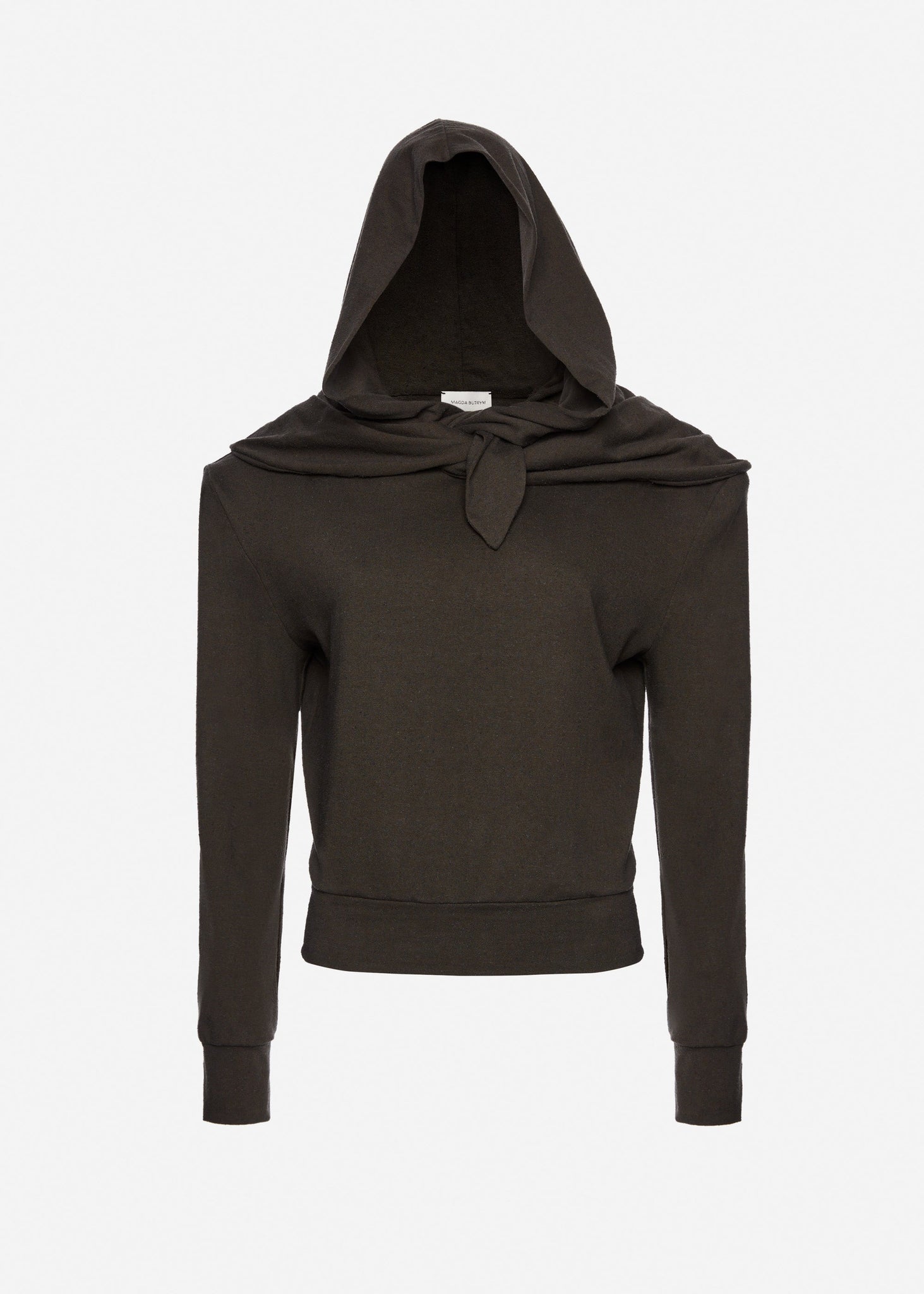 A shoulder padded sweatshirt with a hood that ties under the chin for a slavic feel.
