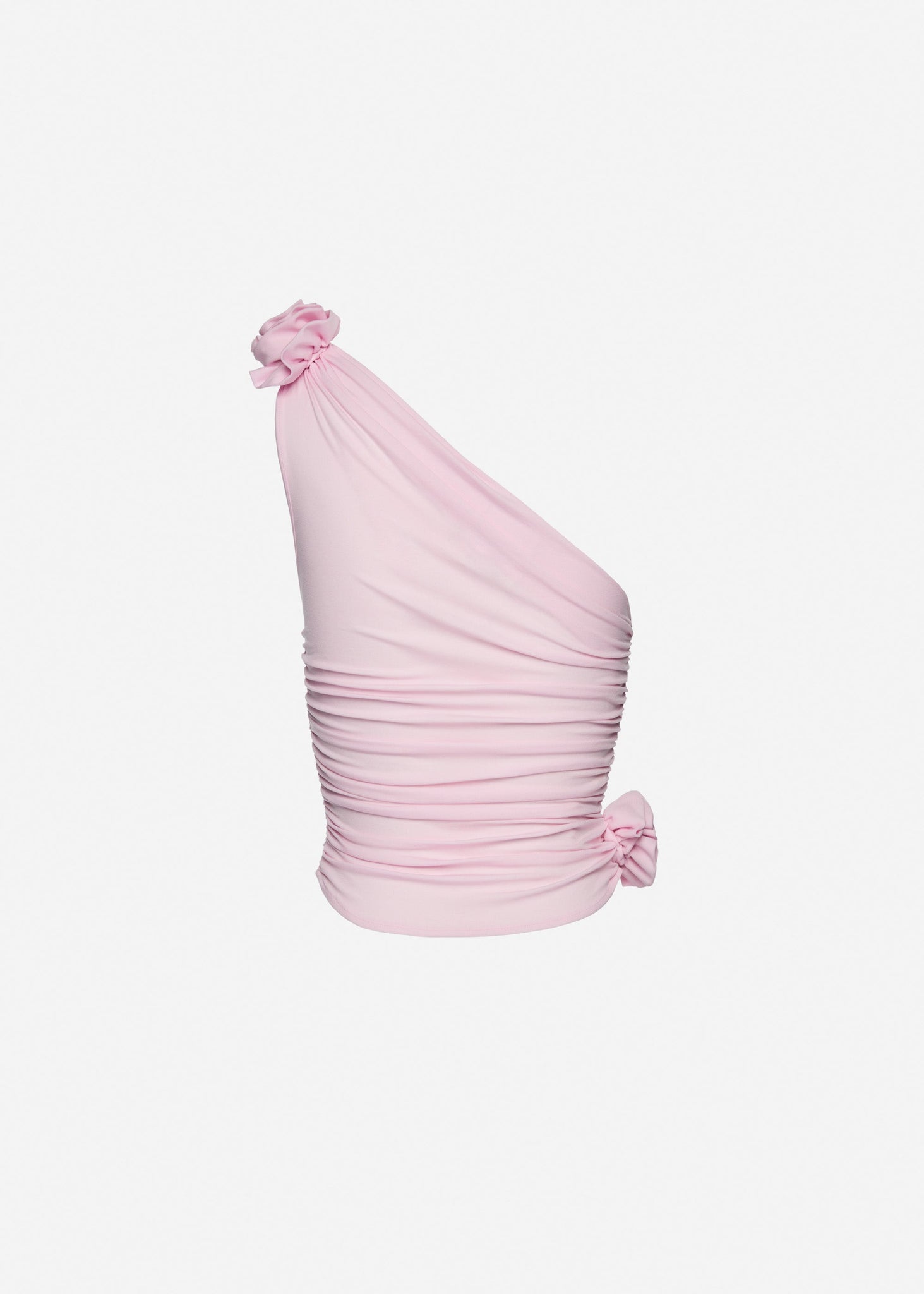 Magda reinvisions the classic t-shirt in a totally modern way: a lightweight one-shoulder asymmetrical top with ruched detailing and 3D cotton roses.