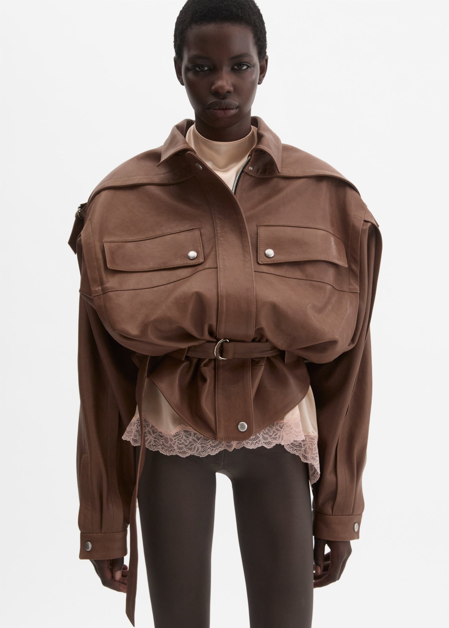 A fluid silk blouse with a high neckline that fastens at the back with a delicate hook. The open back is tied with long flowing sashes for an elegant draped effect. Finished with side slits and a scalloped lace trim along the hem. Comes with a detachable flower brooch for optional embellishment.