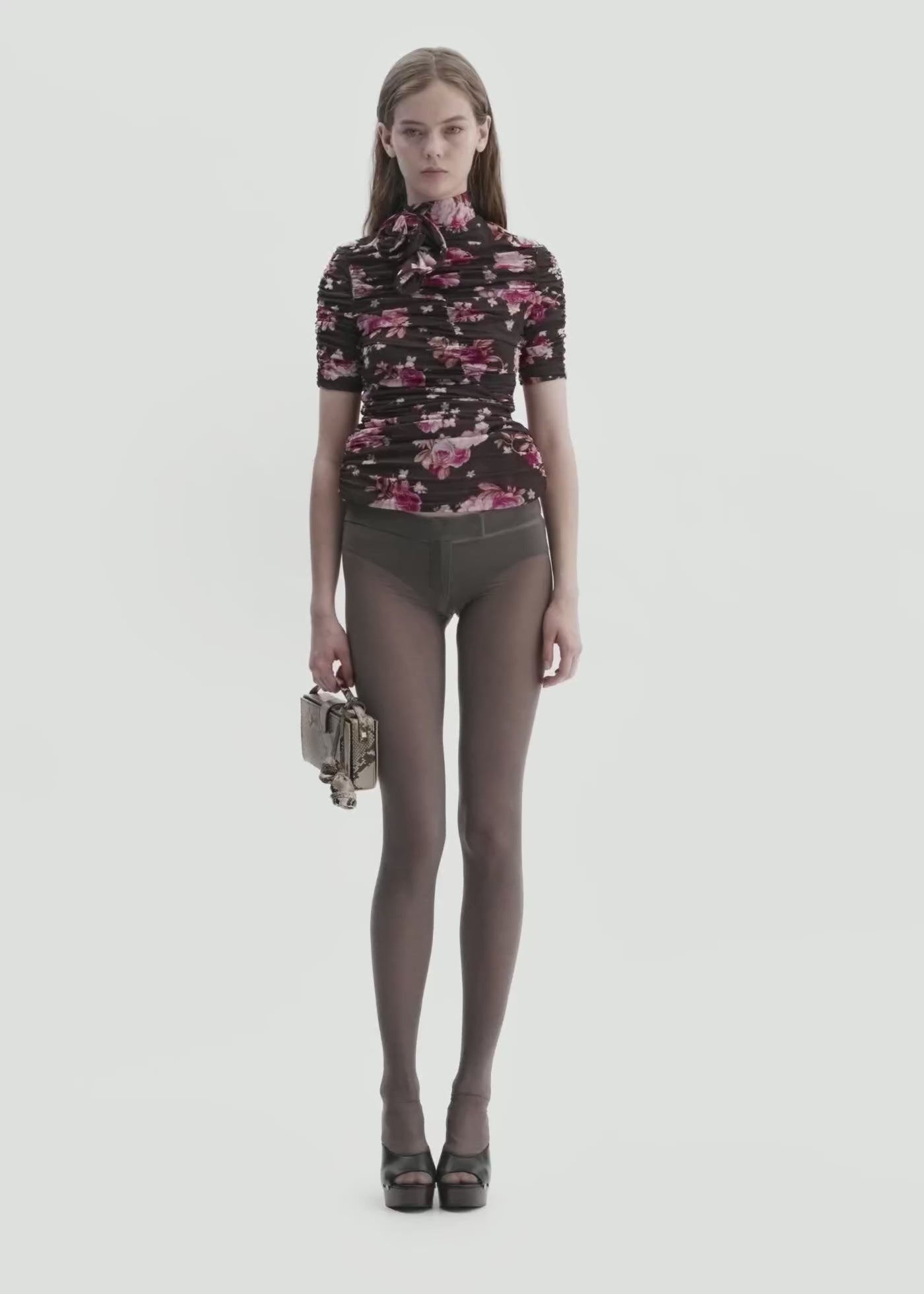 A fitted hip-length blouse crafted from a stretch silk blend with a rich floral motif. Designed with a high ruched neckline and short gathered sleeves, it features diagonal front seams and softly draped ruching throughout the body. A sculptural flower detail is attached at the neck, while subtle padding enhances the hips for a feminine silhouette. Finished with a concealed zip closure at the back.