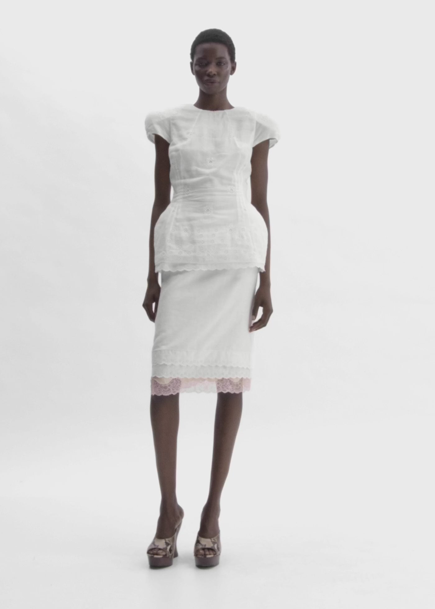 A fitted short-sleeve blouse crafted from a delicate blend of cotton and linen with subtle embroidery throughout. Designed with a round neckline and a defined waist shaped by precise darts. Light shoulder and hip padding create a sculpted silhouette. The piece is fully lined with an additional mesh layer finished in decorative lace, which subtly extends beyond the hem. Closes at the back with a concealed zip.