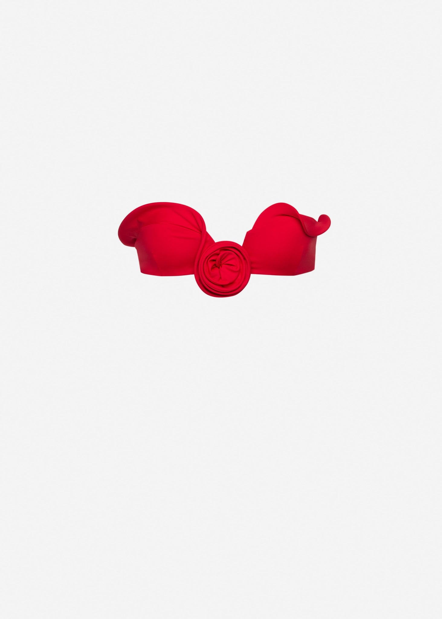 An elegant black bandeau swim top featuring a sculptural design and adorned with a standout rose-shaped centerpiece for a touch of romance. Pairs beautifully with matching or contrasting swim bottoms for a refined, chic look.